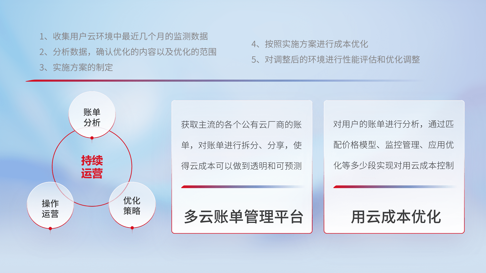 通过多云纳管,,,以统一的资源数据模型把客户的云资源进行抽象和封装,,,,进而实现对多云资源的统一操作,,,保障云资源管理的可靠性、、稳定性与可用性。。。量身定制化运维内容,,,,配置、、、、开发运维、、补丁管理、、备份、、、监控、、认证和访问管理、、、、审计和日常巡检等,,保障在用云过程中的可靠度,,,稳定度以及高可用率。。