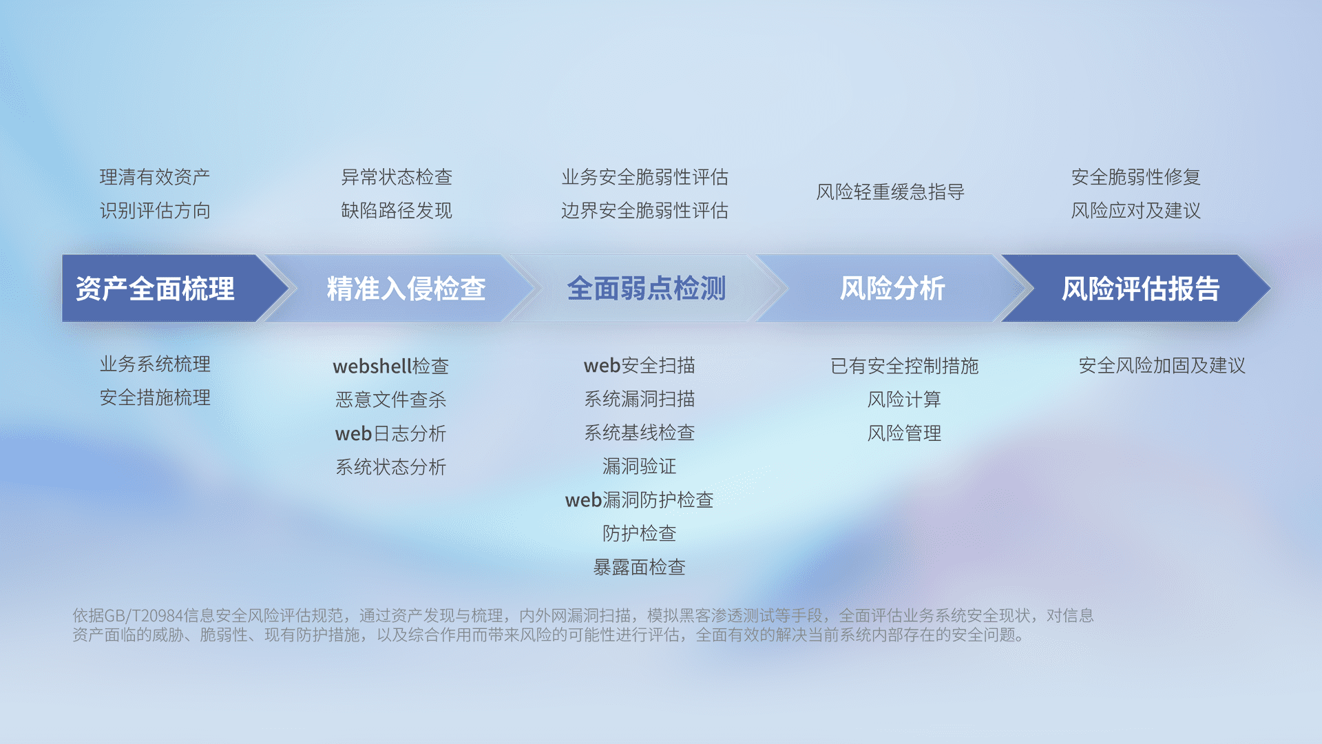 针对客户行业特性,,以专业的安全服务+多厂商联合解决方案提供专属的一站式安全管理服务,,,,帮助客户全面感知网络空间威胁,,基于识别、、、、检测、、分析、、防护、、监测、、、响应的服务理论模型,,,从方案咨询、、、集成交付、、、、评估验证、、优化加固、、运维运营,,,致力于为客户提供完整的闭环管理式安全服务。。以实战经验为客户打造高抵御风险的安全体系,,帮助客户发现威胁、、对抗威胁、、处置威胁,,,,不断积累安全对抗能力,,,,持续保障数字化安全。。