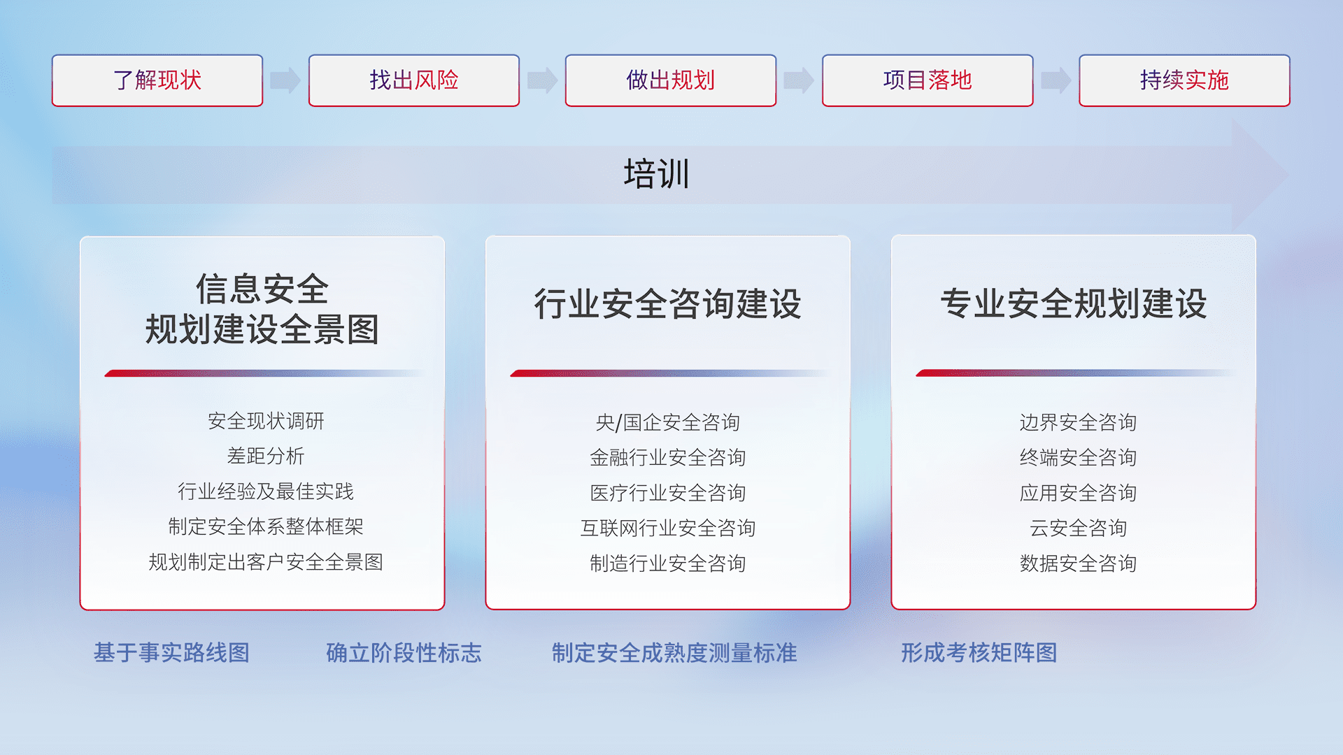 针对客户行业特性,,以专业的安全服务+多厂商联合解决方案提供专属的一站式安全管理服务,,,,帮助客户全面感知网络空间威胁,,基于识别、、、、检测、、分析、、防护、、监测、、、响应的服务理论模型,,,从方案咨询、、、集成交付、、、、评估验证、、优化加固、、运维运营,,,致力于为客户提供完整的闭环管理式安全服务。。以实战经验为客户打造高抵御风险的安全体系,,帮助客户发现威胁、、对抗威胁、、处置威胁,,,,不断积累安全对抗能力,,,,持续保障数字化安全。。
